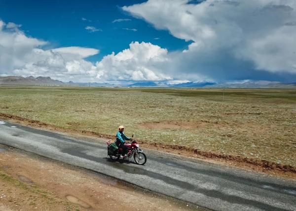 格桑次仁騎摩托車投遞郵件,經(jīng)過長(zhǎng)途跋涉后海拔5500米的沙空村出現(xiàn)在前方(7月27日攝)