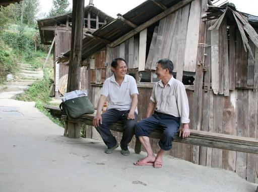 張林昌(左)在郵路上與村民嘮家常,了解村民困難