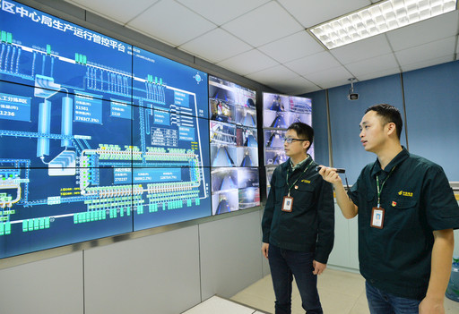 汪磊(右)與團(tuán)隊成員一起了解生產(chǎn)管控平臺運行情況。