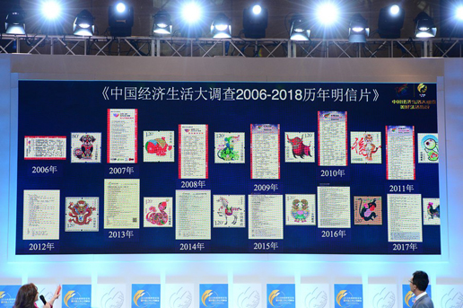 在啟動儀式現(xiàn)場,主持人與大家一同回顧了“中國經(jīng)濟(jì)生活大調(diào)查”歷年明信片、信卡;現(xiàn)場播放的短片,講述了郵遞員是如何將明信片、信卡送到老百姓手上,又是如何進(jìn)行問卷調(diào)查的。