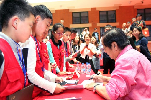 5月10日,“與藝術(shù)大師面對(duì)面”韓美林上海郵迷見面會(huì)在上海市郵政分公司郵政大樓中庭舉行。見面會(huì)上,韓美林講述了自己的“郵票情緣”,并為從四面八方趕來的各個(gè)年齡段的郵迷在己亥年生肖郵品和集郵文化叢書《美林郵緣》上簽名,還特地為多位“資深郵迷”手繪生肖豬。一位排了3小時(shí)隊(duì)拿到大師簽名的年輕郵迷激動(dòng)地說:“我特地連夜從杭州乘火車趕來,能夠一睹大師風(fēng)采,覺得特值?!眻D為韓美林為慕名前來的《小主人報(bào)》的小記者們簽名?! 跎虾S浾?nbsp; 周煉 攝影報(bào)道