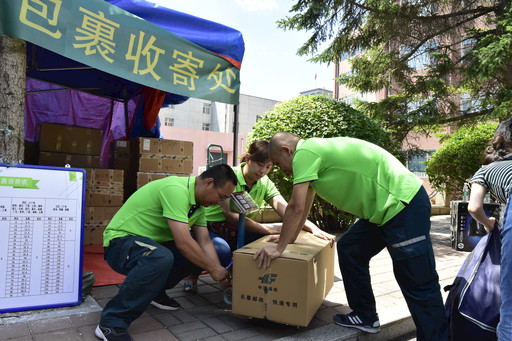 6月中旬,吉林省郵政分公司啟動(dòng)畢業(yè)季校園包裹項(xiàng)目,選派專職攬收員進(jìn)駐校園,為畢業(yè)生提供免費(fèi)上門取件、包裝等服務(wù)。該分公司還利用線上掃碼自助下單平臺(tái),提高電子面單使用率,同時(shí)宣傳郵政包裝箱綠色、環(huán)保、可循環(huán)性,助力綠色郵政建設(shè)。圖為郵政工作人員在吉林大學(xué)校園內(nèi)設(shè)點(diǎn)收寄畢業(yè)生包裹 □吉林記者 郭慧婷 通訊員 孫作偉 攝影報(bào)道