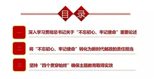 習近平總書記在“不忘初心、牢記使命”主題教育工作會議上深刻闡述了開展主題教育的重大意義、根本任務(wù)、目標要求和重點措施。廣大郵政黨員干部要進一步用習近平新時代中國特色社會主義思想武裝頭腦,指導實踐,緊扣郵政初心使命,緊密結(jié)合工作實際,將初心使命轉(zhuǎn)化為強烈的政治自覺、思想自覺和行動自覺,堅持質(zhì)量第一、效益優(yōu)先,推動企業(yè)高質(zhì)量發(fā)展,把中國郵政打造成為行業(yè)“國家隊”。
