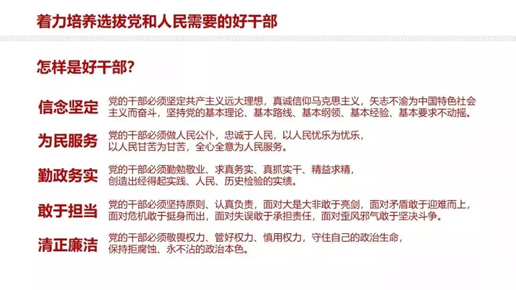 在新時代,好干部要做到信念堅定、為民服務(wù)、勤政務(wù)實、敢于擔當、清正廉潔。理想信念堅定,是好干部第一位的標準,是不是好干部首先看這一條;堅持原則、敢于擔當是黨的干部必須具備的基本素質(zhì)。