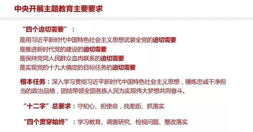 開展這次主題教育,就是要堅持思想建黨、理論強黨,堅持學思用貫通、知信行統(tǒng)一,推動廣大黨員干部不斷增強“四個意識”、堅定“四個自信”,堅決做到“兩個維護”,最關(guān)鍵的是堅決維護習近平總書記黨中央的核心、全黨的核心地位,做到“三個體現(xiàn)在”:體現(xiàn)在與黨中央保持高度一致上,體現(xiàn)在嚴守黨的政治紀律和政治規(guī)矩上,體現(xiàn)在堅決貫徹落實黨中央重大決策部署上。
