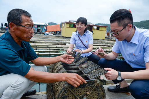 今年鮑魚喜迎豐收,養(yǎng)殖戶正津津樂道地向信貸員介紹鮑魚的喜人長勢。