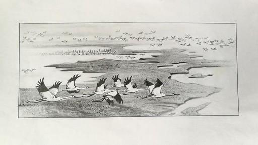 “這枚郵票是整套郵票中創(chuàng)作設(shè)計(jì)難度最大,也是修改次數(shù)最多的?!睏罾蠋熃榻B,起先并不清楚東方白鸛與白鶴的差別,經(jīng)過專家的詳盡介紹才了解到,白鶴飛時(shí)翅膀是展開的、有些分散,而白鸛飛時(shí)翅膀仍然比較整齊。在后期修改時(shí),白鸛的特寫和造型單獨(dú)畫了好幾次,再借用電腦進(jìn)行合成處理。山與水、湖與江、鳥與草,為了前后照應(yīng),楊老師在該枚郵票上運(yùn)用了一些西洋手法,實(shí)現(xiàn)了中西合璧。