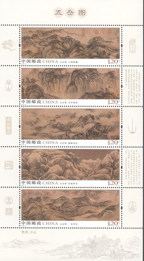 最終,這幅“不求形似,唯求達(dá)意”的名畫被定格于一套5枚郵票之上,完整地展示了原畫獨(dú)特的風(fēng)貌。第一圖為“日觀晴曦”,表現(xiàn)泰山旭日東升的壯觀景致。第二圖“太華清秋”描繪的是華山懸崖峭壁的險(xiǎn)峻山勢(shì),蒼松小橋,瀑樹相映。第三圖“融峰雨色”刻畫的是衡山祝融峰煙雨縹緲的夏日景致。第四圖“恒塞積雪”展現(xiàn)的是恒山白雪皚皚的冬季景觀。第五圖“二室爭(zhēng)奇”表現(xiàn)的是嵩山叢山峻嶺的中原山脈及點(diǎn)綴其間的清幽古寺。
