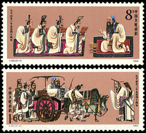 我國歷史上著名的教育家首推孔子,他的光輝形象曾多次繪入我國郵票和郵資封??鬃右簧铝τ诮逃?,在教學(xué)實(shí)踐中積累了豐富、有益的經(jīng)驗(yàn),成為名貫古今、蜚聲中外的大思想家、大政治家和大教育家,并成為我國儒家的創(chuàng)始人。1989年9月28日發(fā)行的《孔子誕生二千五百四十周年》紀(jì)念郵票一套2枚,小型張1枚。第一枚“杏壇講學(xué)”是孔子給弟子授課的情景;第二枚“周游列國”圖案是孔子率弟子乘牛車到各國宣傳其政治主張的場面;小型張“孔子像”是設(shè)計(jì)者根據(jù)唐代“畫圣”吳道子的《孔子行教圖》而繪成的孔子立像,疏眉朗目,神采奕奕。1999年9月28日發(fā)行一枚《孔子誕生2550周年》紀(jì)念郵資信封。2000年11月11日發(fā)行的《古代思想家》紀(jì)念郵票和2010年9月28日發(fā)行的《孔廟、孔府、孔林》特種郵票,再次出現(xiàn)孔子。除孔子外,孟子、荀子也是我國古代著名的思想家、教育家,在《古代思想家》郵票中也有他們的一席之地。