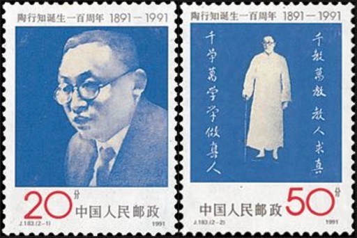 在中國郵政發(fā)行的紀(jì)念近代民主革命家、愛國人士的郵票中,從事過教師職業(yè)的有章太炎、蔡元培、徐錫麟、陶行知、李濟(jì)深、張瀾、黃炎培、馬敘倫等。其中蔡元培、陶行知、黃炎培和馬敘倫則是我國近代著名的教育家,他們畢生致力于教育事業(yè),為中華振興創(chuàng)辦學(xué)校,為民族崛起教書育人。蔡元培在19世紀(jì)末中華民族面臨嚴(yán)重危機(jī)的關(guān)頭,決心“主持教育,以啟發(fā)民智”,向?qū)W生灌輸革命思想,培養(yǎng)革命新人。1988年1月11日發(fā)行《蔡元培誕生一百二十周年》紀(jì)念郵票一套2枚,第一枚“學(xué)界泰斗”圖案是蔡元培的頭像,第二枚“人世楷?!眻D案是蔡元培坐在椅子上的全身像。陶行知主張教育革新,提出生活即教育、社會即學(xué)校、教學(xué)做合一的教育理論體系。1991年10月18日發(fā)行《陶行知誕生一百周年》紀(jì)念郵票一套2枚,第一枚“陶行知像”圖案是陶行知的半側(cè)面頭像,第二枚“求真與做人”圖案是拄著手杖的陶行知立像,立像兩側(cè)有陶行知親筆手書的“千教萬教教人求真,千學(xué)萬學(xué)學(xué)做真人”聯(lián)語。黃炎培早年致力于職業(yè)教育和普通教育,創(chuàng)辦中華職業(yè)學(xué)校,提倡勞工神圣、手腦并用,注重實(shí)踐的實(shí)用教育,并主張教育喚起民眾。1993年5月15日發(fā)行的《愛國民主人士(第一組)》紀(jì)念郵票,其中第四枚為“愛國民主人士——黃炎培”。馬敘倫早年以教書為業(yè),后長期擔(dān)任高等院校和教育行政部門領(lǐng)導(dǎo)職務(wù),新中國成立后曾任文化教育委員會副主任、教育部部長和高教部部長。1994年2月25日發(fā)行《愛國民主人士(第二組)》紀(jì)念郵票,其中第三枚為“愛國民主人士——馬敘倫”。
