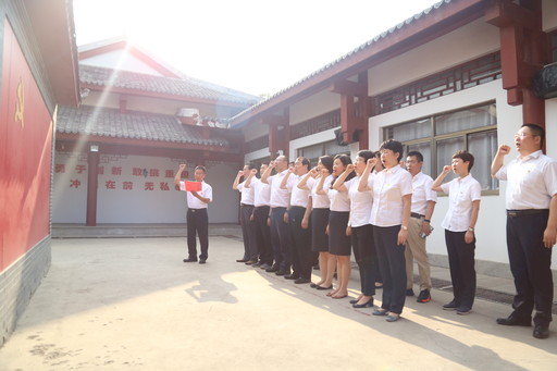 山東省分行黨員干部在山東原山艱苦創(chuàng)業(yè)教育基地重溫入黨誓詞。