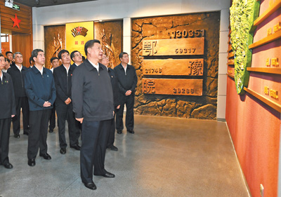 接著,習(xí)近平來到鄂豫皖蘇區(qū)首府革命博物館,了解鄂豫皖蘇區(qū)的革命歷史。鄂豫皖蘇區(qū)是中國共產(chǎn)黨在土地革命戰(zhàn)爭時(shí)期領(lǐng)導(dǎo)創(chuàng)建的根據(jù)地之一,是僅次于中央蘇區(qū)的第二大革命根據(jù)地,誕生了多支紅軍主力,創(chuàng)造了“28年紅旗不倒”的奇跡。解放戰(zhàn)爭時(shí)期,這里是劉鄧大軍千里挺進(jìn)大別山的落腳地。博物館展陳了許多珍貴的革命文物,習(xí)近平駐足察看,不時(shí)同大家交流,追憶崢嶸歲月。習(xí)近平強(qiáng)調(diào),開展“不忘初心、牢記使命”主題教育,黨員、干部要多學(xué)黨史、新中國史,自覺接受紅色傳統(tǒng)教育,常學(xué)常新,不斷感悟,鞏固和升華理想信念。革命博物館、紀(jì)念館、黨史館、烈士陵園等是黨和國家紅色基因庫。要講好黨的故事、革命的故事、根據(jù)地的故事、英雄和烈士的故事,加強(qiáng)革命傳統(tǒng)教育、愛國主義教育、青少年思想道德教育,把紅色基因傳承好,確保紅色江山永不變色。