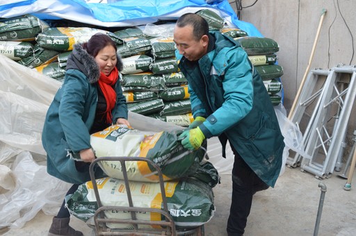 苗永強(qiáng)夫妻倆幫農(nóng)戶轉(zhuǎn)運(yùn)郵政分銷化肥。