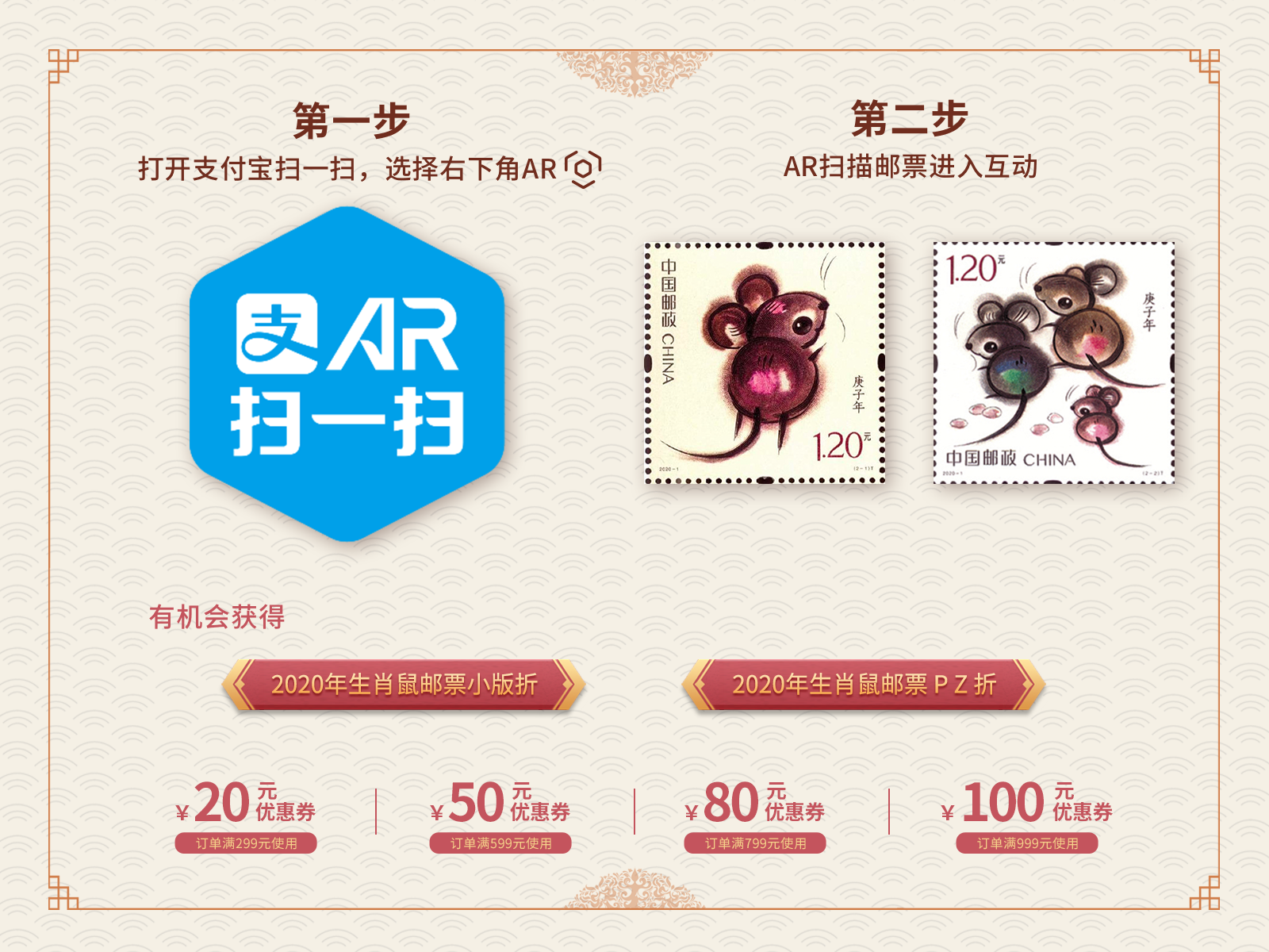 2020年是庚子年,也是我國生肖郵票發(fā)行40年。今年的《庚子年》鼠年生肖郵票,除了郵票本身,還帶來了非常多的趣味玩法,包括:看AR與生肖鼠互動(dòng)、DIY鼠年郵票送祝福、尋找奇妙博物館里的新年禮物、看直播抽大獎(jiǎng)。讓我們一一揭曉。