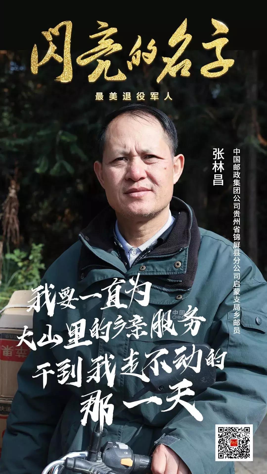張林昌1983年入伍,1987年退役后主動申請到全縣最難走的郵路送信送報,32年來堅持為偏居一隅的苗族侗族同胞投遞報刊、郵件140多萬件,在大山里跋涉超過24萬公里,相當于走了19次“二萬五千里長征”;他義務為山區(qū)群眾代購農(nóng)作物良種、生活用品,代取款,被群眾稱為“鄉(xiāng)郵路上的天使”和“九十九道拐上的綠色使者”。他曾獲全國勞動模范、第四批全國崗位學雷鋒標兵、中國好人、全國模范退役軍人等稱號。