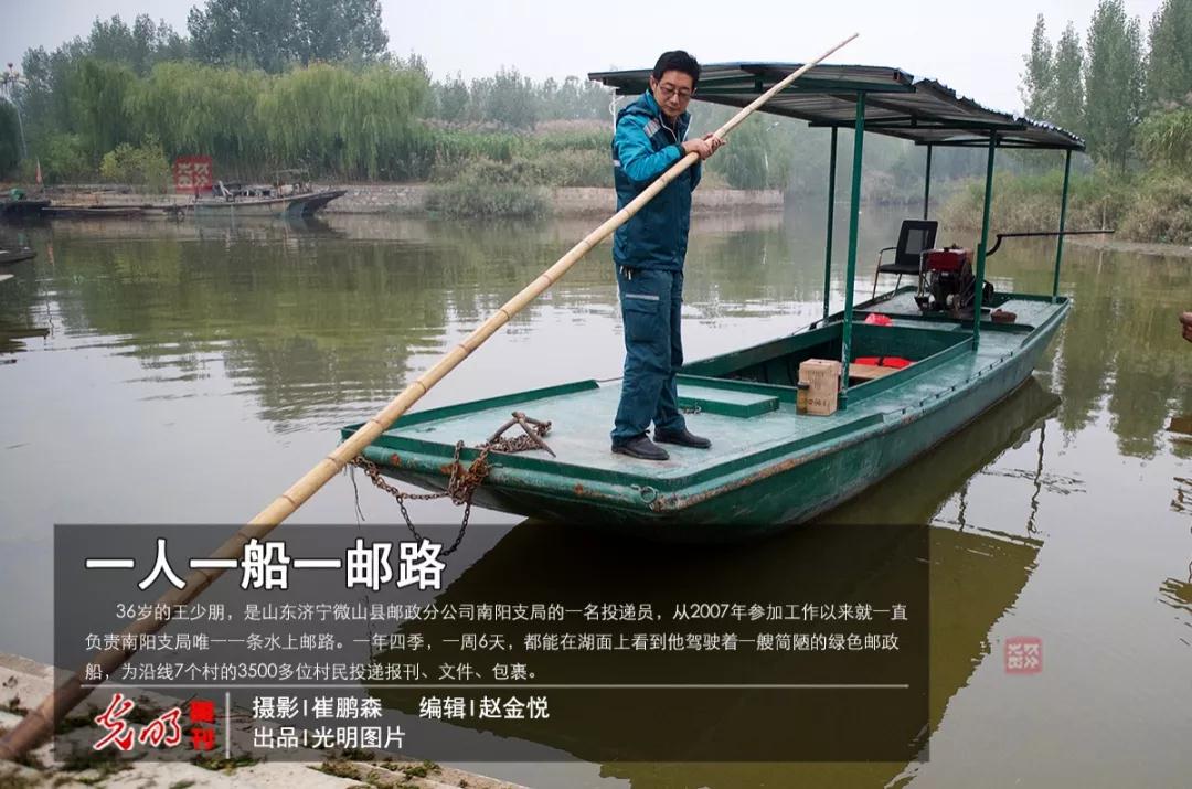 36歲的王少朋,是山東濟寧微山縣郵政分公司南陽支局的一名投遞員,從2007年參加工作以來就一直負責(zé)南陽支局唯一一條水上郵路。一年四季,一周6天,都能在湖面上看到他駕駛著一艘綠色郵政船,為沿線7個村的3500多位村民投遞報刊、文件、包裹。12年,他在這條水上郵路行駛了30多萬公里。