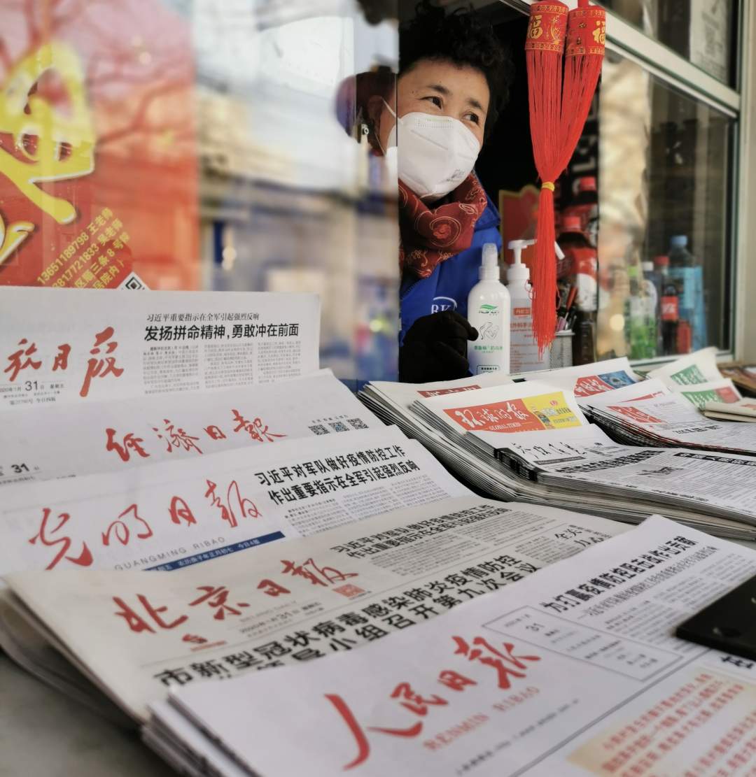 這個春節(jié)與往年不同,她開門第一件事兒,就是做好報刊亭的清潔消毒和自己的防護(hù)工作。她說,北京市報刊零售公司為我們配發(fā)了免洗消毒液和消毒劑,每天詢問健康情況,叮囑我們注意防護(hù)。9:30,一位老大姐過來買《北京日報》和《參考消息》;還有人來打聽晚報和疫情情況;9:40,一個快遞小哥兒習(xí)慣地把車停在報刊亭旁邊,掃碼4塊錢買了《北京日報》《參考消息》《環(huán)球時報》,直說好幾天沒看報了。今年從除夕到初七,這個報刊亭銷售報刊1599元,《人民日報》《北京日報》《參考消息》《北京晚報》累計銷售近500份。大姐這些天雖然總是戴著口罩,可一見到老客戶,眼角笑容立馬蕩漾出來,郵局配發(fā)的消毒液,她就擺在柜臺前面,經(jīng)常招呼顧客們消毒使用。問她怎么不關(guān)門休息幾天?。克πφf,“周邊老人需要我啊,他們說報刊亭可不能再關(guān)了門了,每天就想著到報刊亭來溜達(dá)一圈呢”。