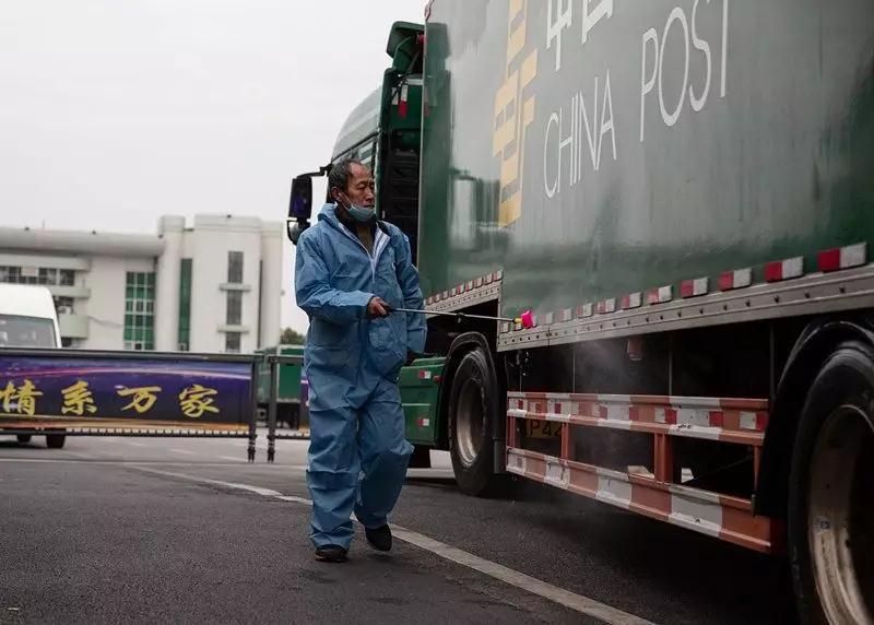 2月1日,武漢郵區(qū)中心局,工作人員噴灑稀釋的84消毒液為郵車消毒。來(lái)自全國(guó)各地經(jīng)郵政系統(tǒng)送來(lái)的救援物資抵達(dá)中心局就意味著到達(dá)了武漢,從大年三十開(kāi)始,有專人每天對(duì)進(jìn)出車輛進(jìn)行噴灑消毒。