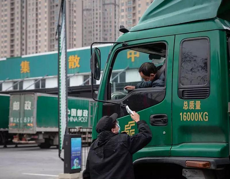 2月1日,武漢郵區(qū)中心局,工作人員為郵車司機(jī)測(cè)量體溫。