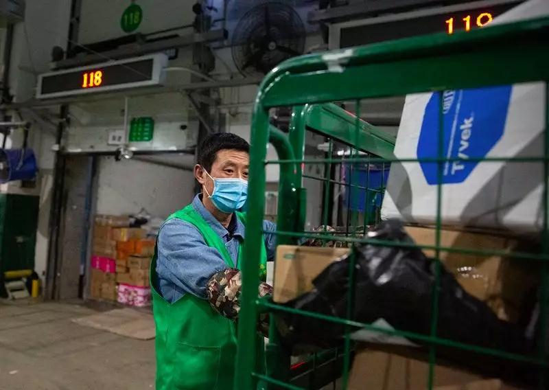 每天,綠色郵車不斷將物資匯集到位于武漢國(guó)際博覽中心的武漢市紅十字會(huì)臨時(shí)倉(cāng)庫(kù),來(lái)自多個(gè)郵政投遞點(diǎn)的工作人員幫助將物資卸車、分類。