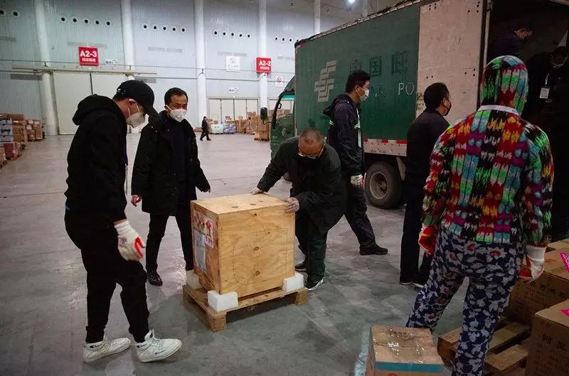 2月1日,武漢國(guó)際博覽中心,臨時(shí)被征用作倉(cāng)庫(kù)的展廳內(nèi),現(xiàn)場(chǎng)志愿者和郵政工作人員從一輛中國(guó)郵政郵車上卸下一批來(lái)自杭州的醫(yī)療物資,其中包括PCR檢測(cè)系統(tǒng)等醫(yī)療設(shè)備。這里匯集了國(guó)內(nèi)外援助物資,來(lái)自武漢各個(gè)投遞點(diǎn)的郵政工作人員常駐現(xiàn)場(chǎng),協(xié)助對(duì)物資進(jìn)行裝卸、分類和配送。