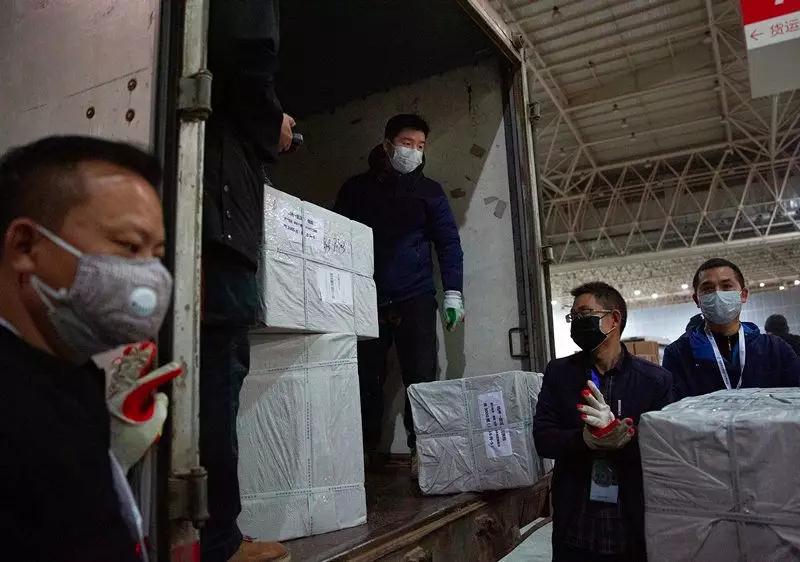 2月1日,武漢國(guó)際博覽中心,臨時(shí)被征用作倉(cāng)庫(kù)的展廳內(nèi),現(xiàn)場(chǎng)志愿者和郵政工作人員正在卸貨。