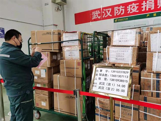 1月25日,中國郵政開通了防疫捐贈物資免費運輸和配送的綠色通道。除了專機運輸外,從北京出發(fā)的陸運物資都是通過北京郵件綜合處理中心發(fā)往武漢。