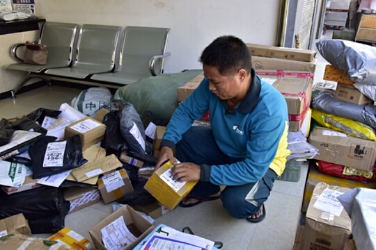 新年第一天,盡管屬法定節(jié)假日,但從州府六庫方向發(fā)來的郵車還是如約抵達郵政所。桑南才打開車廂門——又是滿滿一車包裹!桑南才記得,1987年自己剛到所里上班時,郵車隔天才一班,一個月也就200來份郵件?,F在每天兩班郵車,一天的郵件量都快到200件了。