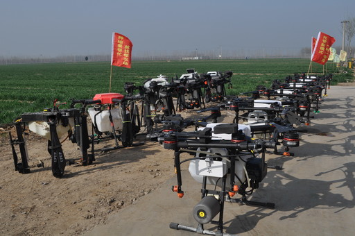 飛防作業(yè)前,11架無人機整齊排開,場面甚是壯觀。