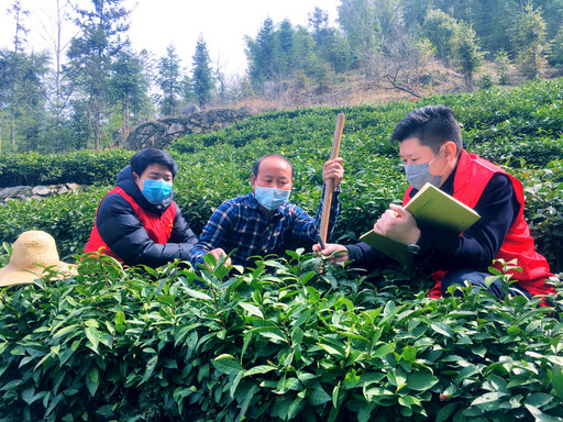 圖為“金融春風(fēng)服務(wù)隊(duì)”在茶園了解春茶追肥與生長(zhǎng)情況,宣傳郵儲(chǔ)貸款產(chǎn)品。 □李明 攝影報(bào)道