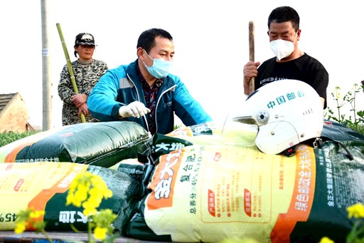 江蘇省射陽(yáng)縣郵政分公司開(kāi)展“戰(zhàn)疫情、搶農(nóng)時(shí)、郵我助,郵農(nóng)一心保春耕“活動(dòng),基層員工利用班前班后時(shí)間將農(nóng)民需要的復(fù)合肥配送到農(nóng)民家門(mén)口、田間地頭,并組織志愿者協(xié)助缺勞力戶(hù)為莊稼施肥鋤草。截至3月17日,該分公司已向全縣農(nóng)民配送復(fù)合肥546噸,幫助17戶(hù)缺勞力戶(hù)解除農(nóng)活上的后顧之憂。圖為通洋支局投遞員將肥料送到農(nóng)戶(hù)地頭?!鮿⒌铝?nbsp; 攝影報(bào)道