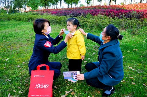 3月20日,郵儲銀行安徽省金寨縣支行在“郵愛公益日”設(shè)立三周年之際,開展宣傳活動。在疫情防控期間,該支行創(chuàng)新舉措,讓宣傳活動、疫情防控及文明創(chuàng)建相結(jié)合,將企業(yè)品牌宣傳與踐行社會責(zé)任深度融合。圖為該支行宣傳人員在公園執(zhí)勤點向居民介紹“郵愛公益”時,為小朋友戴上防護口罩?! 趵蠲?nbsp; 攝影報道