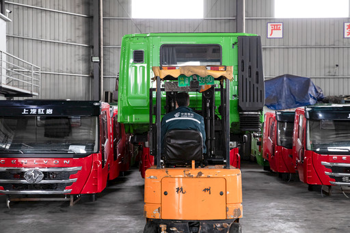 重慶郵政員工孫西滿正駕駛著叉車裝運上汽紅巖重卡配件。 朱亞坤 攝