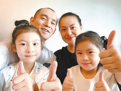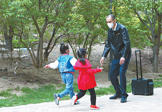 3 月26 日,隔離期滿回家。王曉輝剛進(jìn)小區(qū),兩個(gè)寶貝兒就歡快地迎上前去。