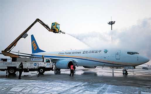 2 月14 日,北京首都機(jī)場(chǎng)降雪,王曉輝機(jī)長(zhǎng)將執(zhí)飛郵政CF9121 航班奔赴湖北,圖為對(duì)飛機(jī)進(jìn)行除冰作業(yè)。