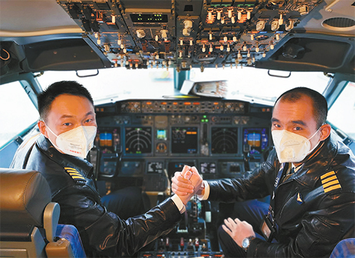 1 月27 日,在首班防控疫情醫(yī)療物資專機(jī)起飛前,王曉輝和黃宏佳(左)緊握?qǐng)?zhí)舵之手,發(fā)出“我是共產(chǎn)黨員,我堅(jiān)守在防控疫情阻擊戰(zhàn)崗位”的心聲。