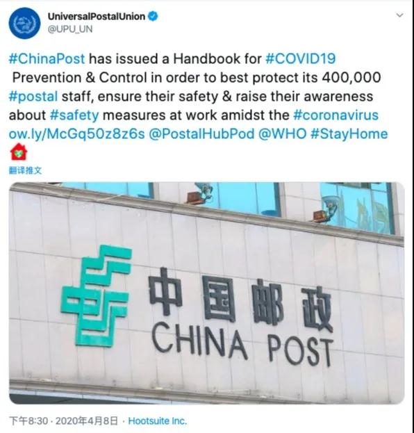4月9日,萬國郵政聯(lián)盟在其官方社交媒體上發(fā)布了由中國郵政集團(tuán)有限公司制作的《新冠病毒防護(hù)指導(dǎo)手冊(cè)》英文版,向世界分享中國郵政的疫情防控經(jīng)驗(yàn)。