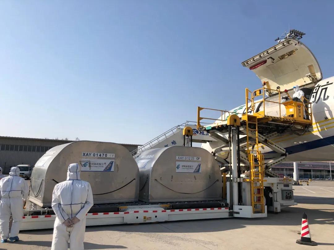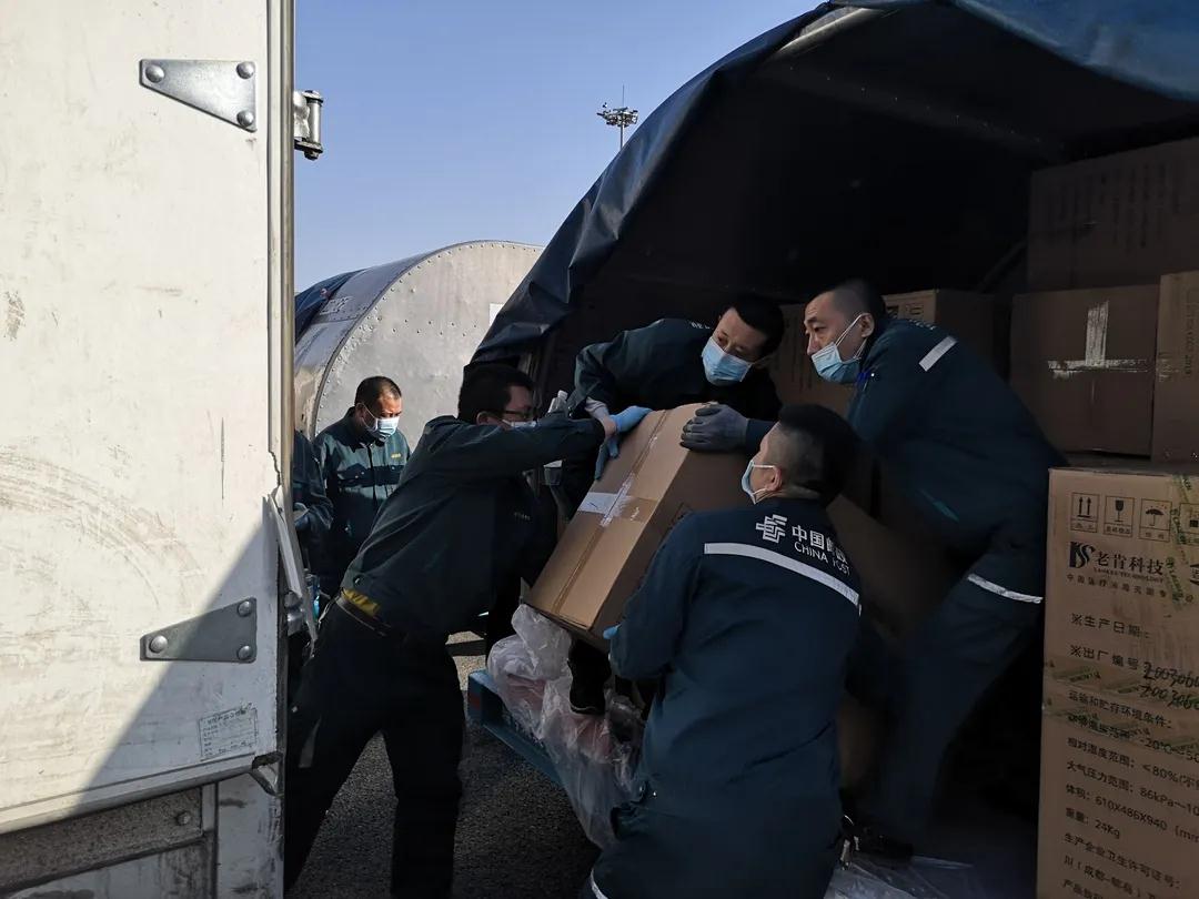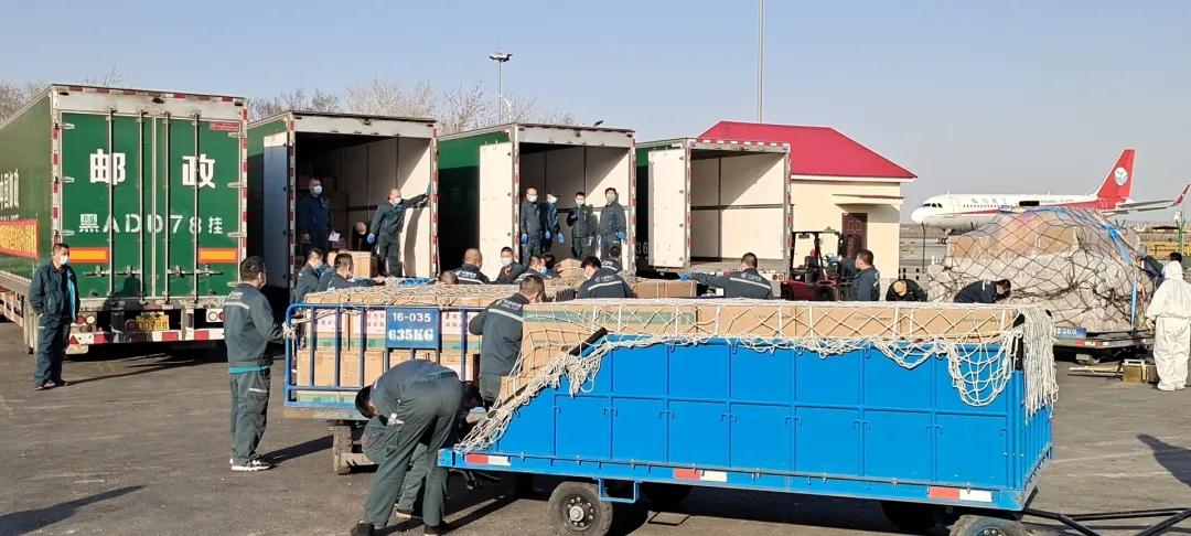 哈爾濱郵區(qū)中心局員工將郵航包機(jī)運(yùn)抵的醫(yī)用物資進(jìn)行裝車。
