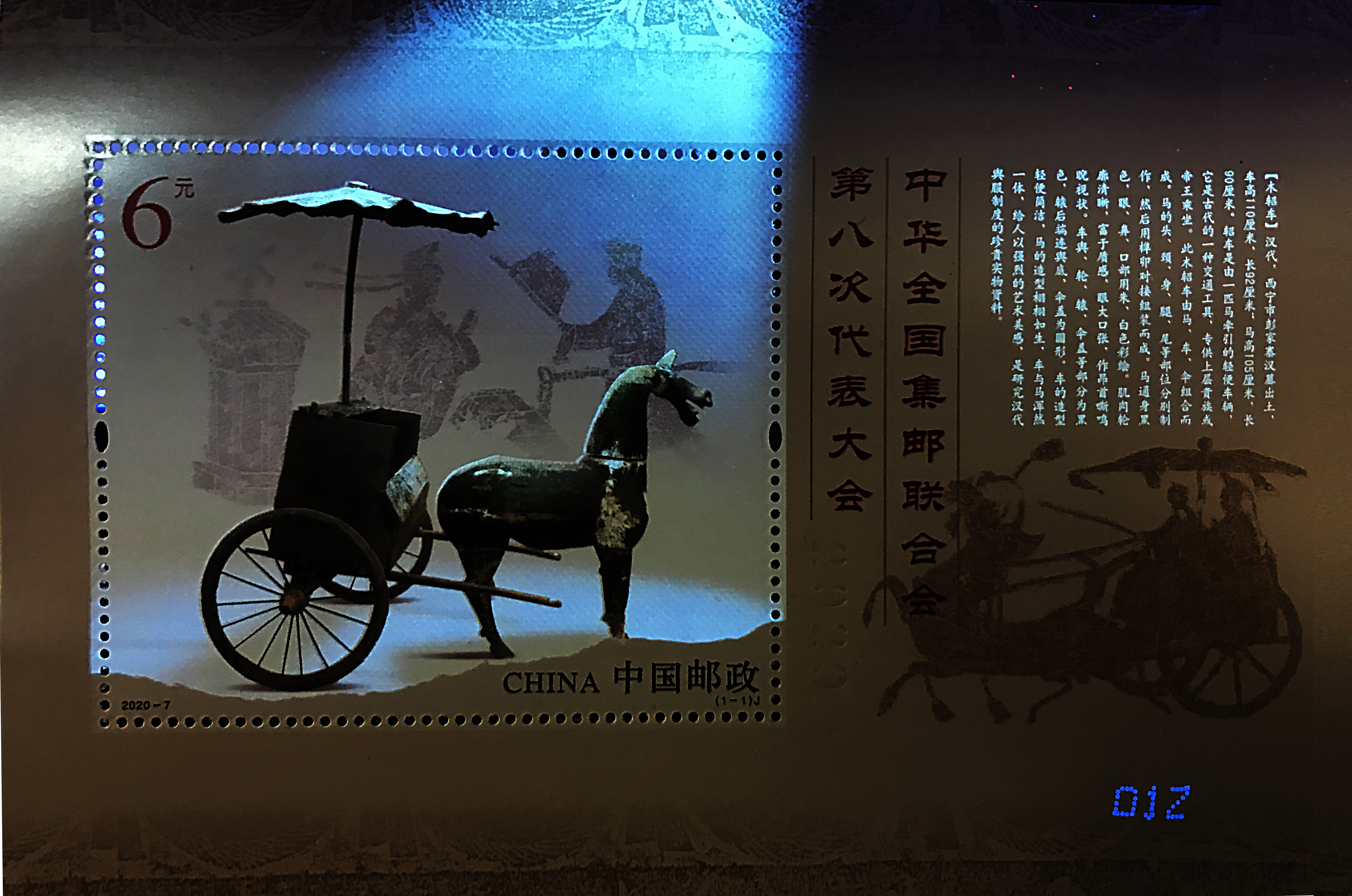 該套郵票由馬立航設計,北京郵票廠影膠套印工藝印制。在印刷方面突破常規(guī),把平凡的技術,做到極致。采用影寫和膠版套印的方式,實現了傳統印制工藝的組合創(chuàng)新。同時,在紫外光下營造出博物館內的觀賞效果,光線匯聚木軺車,明暗交錯,仿佛穿越千年歷史。票面上“2020”的印記,記載下集郵聯八大召開的特殊年份。