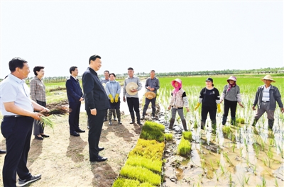 在黃河水滋養(yǎng)下,寧夏平原土地肥沃、物產(chǎn)豐富,素有“塞上江南”之稱。9日下午,習(xí)近平來到銀川市賀蘭縣稻漁空間鄉(xiāng)村生態(tài)觀光園,聽取寧夏現(xiàn)代農(nóng)業(yè)發(fā)展、農(nóng)業(yè)合作社帶動(dòng)農(nóng)民增收致富運(yùn)營(yíng)模式等情況匯報(bào),觀看寧夏特色農(nóng)產(chǎn)品展示,了解稻漁種養(yǎng)業(yè)融合發(fā)展的創(chuàng)新做法。習(xí)近平登上觀景塔,俯瞰園區(qū)全貌。微風(fēng)輕拂,秧苗搖曳,一派生機(jī)勃勃。他沿著田埂走進(jìn)稻田,同正在勞作的村民們親切交談。村民們告訴總書記,現(xiàn)在有土地流轉(zhuǎn)費(fèi)、勞務(wù)費(fèi),還有年底分紅,收入提高了,也有保障了。正值放魚時(shí)節(jié),習(xí)近平舀起魚苗、蟹苗,放進(jìn)田邊水渠。習(xí)近平強(qiáng)調(diào),發(fā)展現(xiàn)代特色農(nóng)業(yè)和文化旅游業(yè),必須貫徹以人民為中心的發(fā)展思想,突出農(nóng)民主體地位,把保障農(nóng)民利益放在第一位。要探索建立更加有效、更加長(zhǎng)效的利益聯(lián)結(jié)機(jī)制,確保鄉(xiāng)親們持續(xù)獲益。要注意解決好稻水矛盾,采用節(jié)水技術(shù),積極發(fā)展節(jié)水型、高附加值的種養(yǎng)業(yè),保護(hù)好黃河水資源。目前,疫情防控形勢(shì)穩(wěn)步向好,要繼續(xù)抓好常態(tài)化疫情防控,加快恢復(fù)社會(huì)生產(chǎn)生活正常秩序。