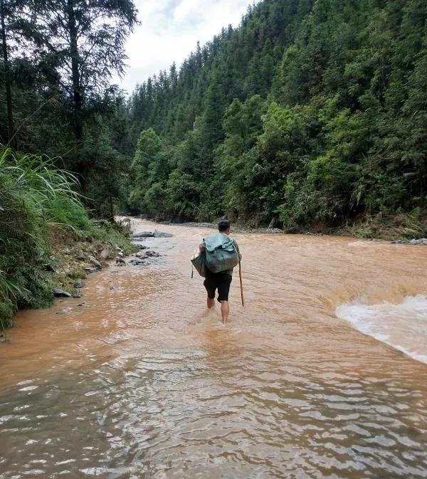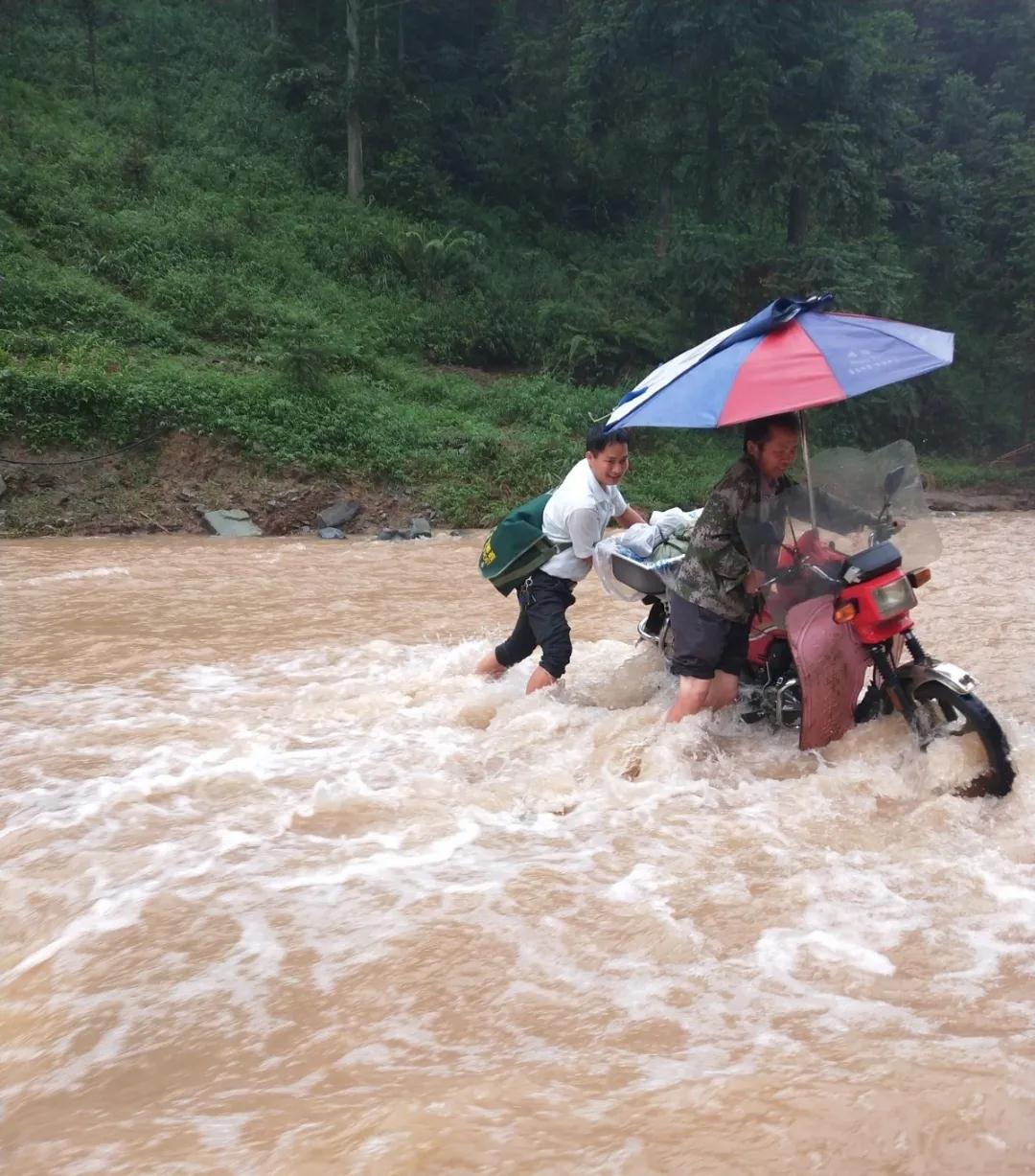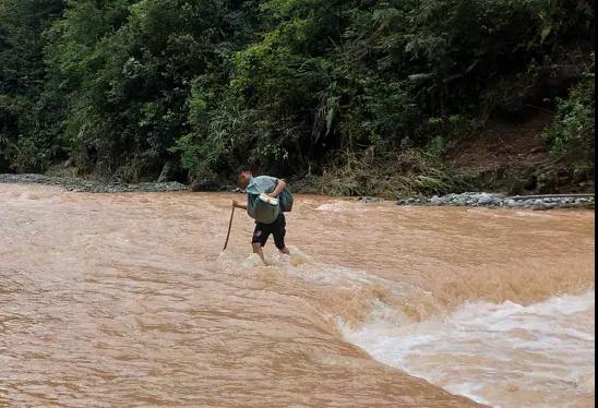 6月11日一早,潘志貴整理好郵件后出發(fā)了。當(dāng)他來到距離友娘村5公里的小河邊時,被洪水擋住了前進的道路,由于水勢過大,車輛沒法通過,于是他停下摩托車,到附近山上找來一根木棍,把郵包挎在自己的肩膀上,一邊手撐木棍一邊在河中試探著移步,之后繼續(xù)徒步走向友娘村。