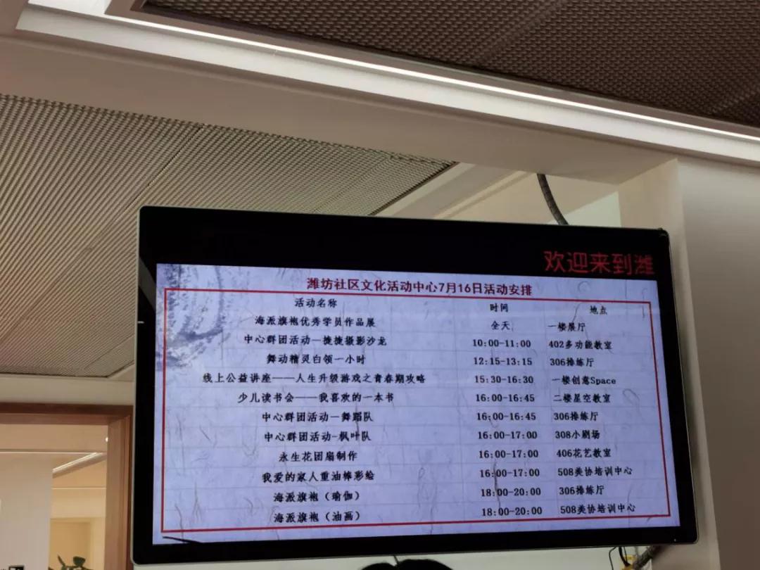 圖為濰坊社區(qū)文化活動(dòng)中心一樓的電子顯示屏,羅列了當(dāng)天的各項(xiàng)活動(dòng)安排。求是記者 侯亞景 攝