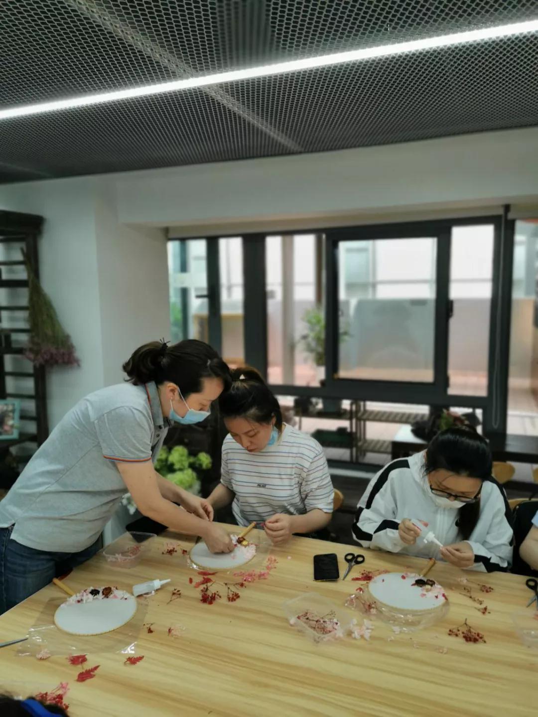 “對(duì),這里的花朵要剪碎一點(diǎn),做這個(gè)要耐心一些?!币晃焕蠋熣诮毯Mㄆ谪浌煞萦邢薰镜?0余位員工制作團(tuán)扇,這是活動(dòng)中心與該公司的團(tuán)建項(xiàng)目。為實(shí)現(xiàn)項(xiàng)目合作多元化,活動(dòng)中心主動(dòng)和周邊企業(yè)共建,從以承接活動(dòng)為主向樞紐型平臺(tái)良性發(fā)展,以樞紐型陣地騰籠換鳥,引入優(yōu)質(zhì)的工作室資源,不斷輻射附近樓宇白領(lǐng),吸引白領(lǐng)成為常駐粉絲,更加高效的推進(jìn)基層文化服務(wù)。