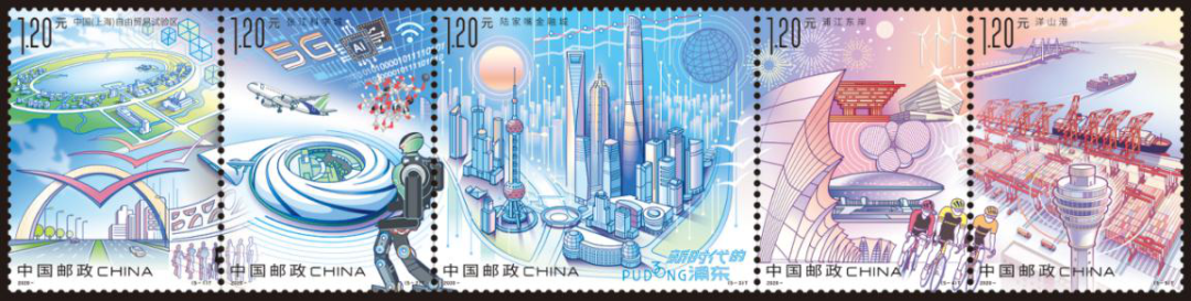 《新時(shí)代的浦東》是為紀(jì)念上海浦東開發(fā)開放30周年,由香港知名設(shè)計(jì)師韓秉華設(shè)計(jì),中國郵政發(fā)行的一套5連票。這是繼1996年發(fā)行《上海浦東》郵票后,時(shí)隔25年再次發(fā)行的上海城市題材郵票。