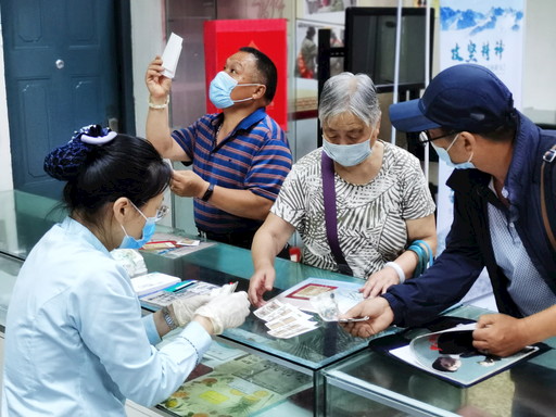 7月11日,江蘇省徐州市淮東集郵營業(yè)廳內(nèi),郵迷正在購買《故宮博物院(二)》特種郵票?! 踔x安吉 攝影報道
