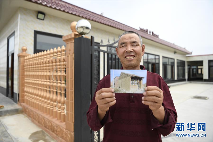 羅宗清在寧夏吳忠市紅寺堡區(qū)新莊集鄉(xiāng)康莊村的新家前展示以前老房子的照片(2019年7月24日攝)。他家于2001年從中衛(wèi)市海原縣搬遷到這里。 新華社記者 馮開華 攝