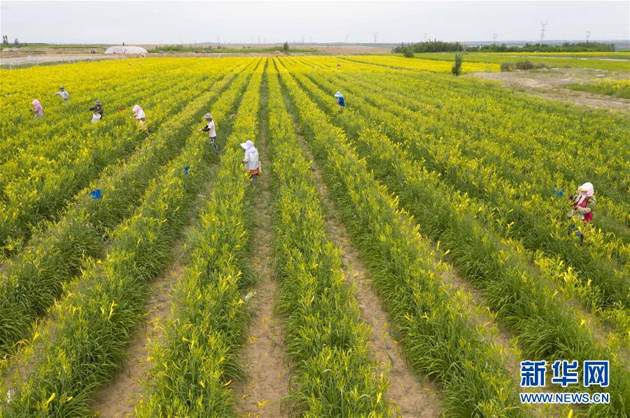 村民在寧夏紅寺堡區(qū)柳泉鄉(xiāng)柳泉村采摘黃花菜(7月11日攝,無人機(jī)照片)。 新華社記者 楊植森 攝