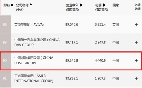 8月10日,《財(cái)富》雜志發(fā)布2020年世界500強(qiáng)排行榜。中國(guó)郵政位列第90名,相比去年上升11位,年?duì)I業(yè)收入、利潤(rùn)均排名世界郵政第二位。