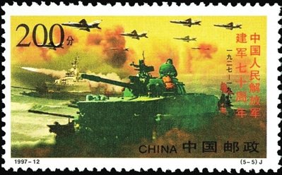 1997年8月1日,中國郵政發(fā)行了1997-12《中國人民解放軍建軍七十周年》紀(jì)念郵票1套5枚,票名分別是“陸軍”“海軍”“空軍”“戰(zhàn)略導(dǎo)彈部隊”和“陸??章?lián)合演習(xí)”5枚郵票,以陸、海、空和戰(zhàn)略導(dǎo)彈部隊的主戰(zhàn)兵器為主圖,背景是按兵種按時間有機(jī)串聯(lián)在一條主線上的建軍七十年來的重大事件,淡彩的背景與重彩的主圖珠聯(lián)璧合,能夠讓人自然重溫人民解放軍七十年的成長歷程,真切感受人民軍隊的現(xiàn)代化步伐。每幅畫面雖沒有出現(xiàn)一個軍人形象,但那隆隆開進(jìn)的坦克、劈波斬浪的軍艦、呼嘯而過的戰(zhàn)機(jī)和騰空而起的導(dǎo)彈,創(chuàng)造了一種千軍萬馬奔騰向前的氣勢,表現(xiàn)出現(xiàn)代化戰(zhàn)爭操縱著現(xiàn)代武器與敵人決戰(zhàn)千里之外的新特點,收到了此處無人勝有人的藝術(shù)效果。