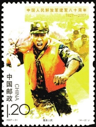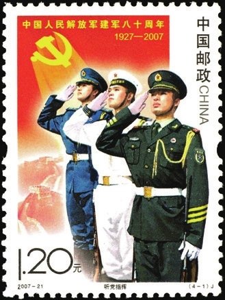 2007年8月1日發(fā)行2007-21《中國人民解放軍建軍八十周年》紀(jì)念郵票1套4枚,畫面生動表現(xiàn)了中國人民解放軍在黨的領(lǐng)導(dǎo)下,發(fā)揚(yáng)聽黨指揮、服務(wù)人民、英勇善戰(zhàn)的優(yōu)良傳統(tǒng),刻苦訓(xùn)練、抗洪搶險,參與聯(lián)合國維和行動,用忠誠和熱血捍衛(wèi)國家主權(quán)和安全,筑起共和國的鋼鐵長城,集中反映出軍隊建設(shè)的新成就和我軍忠實履行歷史使命的時代風(fēng)采。